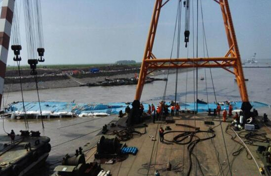 6月5日早上7時(shí)10分,現(xiàn)場(chǎng)救援人員正式對(duì)“東方之星”翻沉客輪實(shí)施扶正救助打撈方案。9時(shí)06分,高15米的“東方之星”號(hào)實(shí)現(xiàn)整體扶正。據(jù)現(xiàn)場(chǎng)救援隊(duì)伍稱(chēng),沉船水下雙利千斤頂穿引為扶正船體發(fā)揮了關(guān)鍵作用。